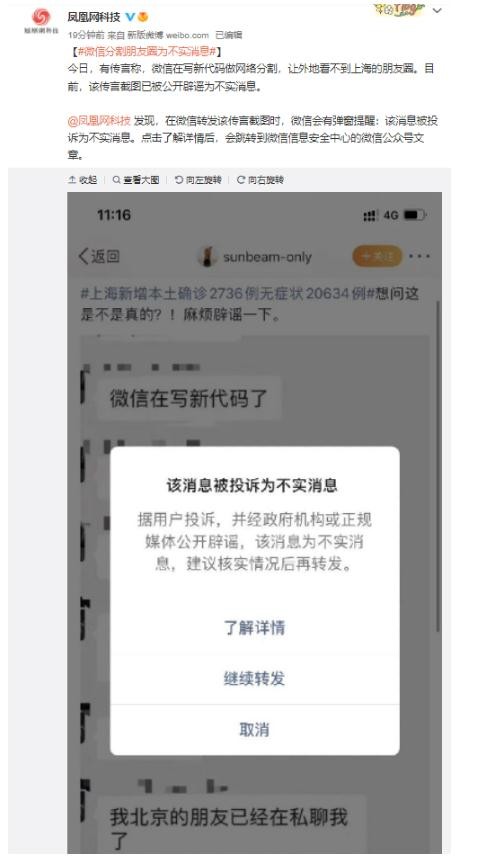 今日,有傳言稱,微信在寫新代碼做網絡分割,讓外地看不到上海的朋友圈。目前,該傳言截圖已被公開辟謠為不實消息。