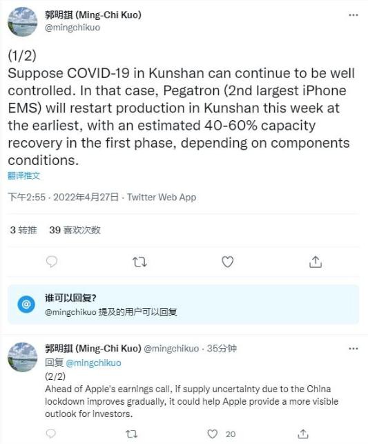 IT 之家 4 月 27 日消息,蘋果分析師郭明錤今日發(fā)推指出,假設昆山疫情形勢持續(xù)好轉,和碩昆山廠最早將于本周在重啟生產(chǎn)。根據(jù)零部件情況,預計和碩第一階段產(chǎn)能就可以恢復 40-60% 的水平。