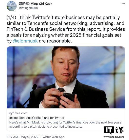 郭明錤指出,2021 年,騰訊來自社交網(wǎng)絡(包括訂閱)、廣告和金融科技及商業(yè)服務的收入分別為 176 億美元、133 億美元和 258 億美元。因此,埃隆?馬斯克(Elon Musk)為 Twitter 制定的 2028 年實現(xiàn) 264 億美元收入的財務目標似乎可以實現(xiàn)。