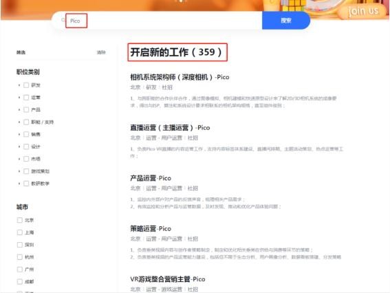 除了內(nèi)部轉(zhuǎn)崗,委派自己人掌控大局,Pico 社交中心也在積極對(duì)外選賢舉能。在字節(jié)跳動(dòng)的招聘官網(wǎng)上,Pico 目前開(kāi)放的招聘崗位多達(dá) 359,囊括了服務(wù)端開(kāi)發(fā)工程師、音視頻編碼高級(jí)工程師、VR 視頻體驗(yàn)設(shè)計(jì)、Unity3D 架構(gòu)師、圖像算法工程師、傳感器算法專家等各個(gè)崗位,分布地區(qū)包括北京、上海、深圳等。