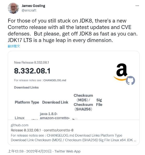 不過醉翁之意不在酒,原來 Java 之父只是為了給東家 AWS 的 OpenJDK 發(fā)行版 Corretto “帶貨”,他建議仍在使用 JDK 8 的開發(fā)者可以考慮使用 Corretto 的新版本——包含了所有最新的更新和 CVE 防御。Corretto 是亞馬遜推出的 OpenJDK 8 的發(fā)行版,它支持多種平臺,可以在云端與本地計算機(jī)上運(yùn)行。每個 Corretto 版本上都會運(yùn)行技術(shù)兼容性工具包(Technology Compatibility Kit,TCK),以確保與 Java SE 平臺相兼容。在不使用到 OpenJDK 中沒有的功能(例如 Java Flight Recorder)的情況下,Corretto 完全可以直接作為 Java SE 發(fā)行版的替代品。