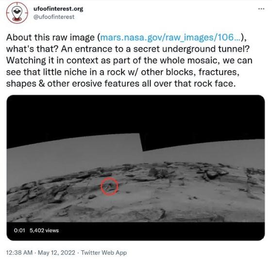 UFO 揭秘者 UFO of Interest 當(dāng)?shù)貢r(shí)間周三在 Twitter 上發(fā)文稱--“把它作為整個(gè)馬賽克的一部分來觀察,我們可以看到巖石上的那個(gè)小凹槽跟其他巖塊、斷裂、形狀和其他侵蝕性特征一起遍布該巖面。”