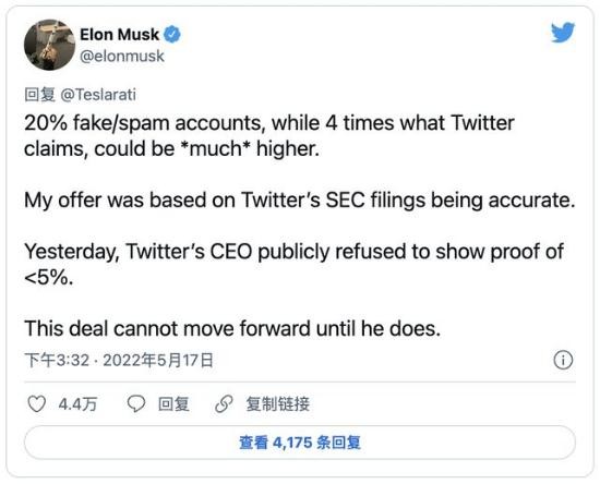 當(dāng)?shù)貢r(shí)間 5 月 17 日,馬斯克在推特上發(fā)文稱,除非推特提供證據(jù)證明其虛假用戶數(shù)量的比例,否則“這筆交易無法推進(jìn)”。