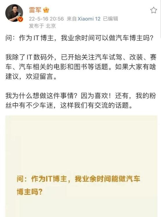 小米創(chuàng)始人、董事長兼 CEO@雷軍在個人社交賬號發(fā)文稱,自己除了做 IT 博主之外,還準(zhǔn)備業(yè)余時間做一個汽車博主。并稱他目前已開始關(guān)注汽車試駕、改裝、賽車、汽車相關(guān)的電影和圖書等話題。