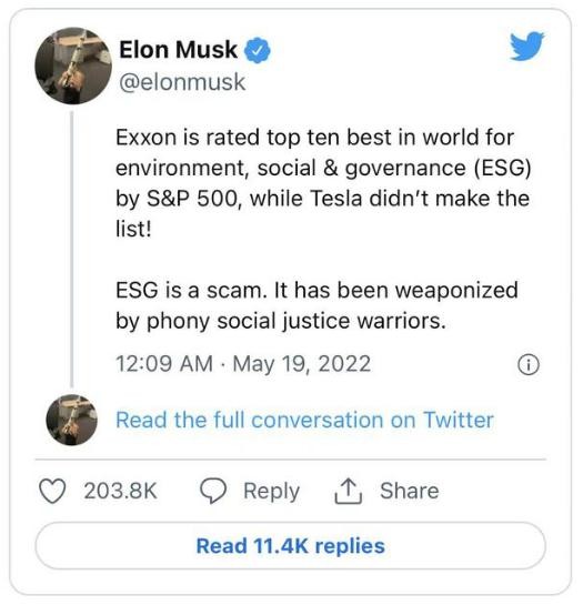 在特斯拉被踢出標(biāo)普 ESG 指數(shù)成份股后,馬斯克在推特上表示,ESG 就是“一個(gè)騙局”。他抱怨稱,“埃克森美孚都被標(biāo)普 500 評(píng)為全球環(huán)境、社會(huì)和治理(ESG)前十,而特斯拉竟然沒有上榜!”