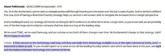 高通 CFO 在摩根大通 JPM 大會上表示,它將在合適的商業(yè)條款下采用英特爾的技術進行產(chǎn)品代工。