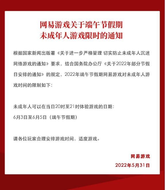 網(wǎng)易游戲表示,根據(jù)國家新聞出版署《關(guān)于進(jìn)一步嚴(yán)格管理切實(shí)防止未成年人沉迷網(wǎng)絡(luò)游戲的通知》要求,結(jié)合國務(wù)院辦公廳《關(guān)于 2022 年部分節(jié)假日安排的通知》的規(guī)定,2022 年端午節(jié)假期網(wǎng)易游戲?qū)ξ闯赡耆擞螒驎r(shí)間的限制如下: