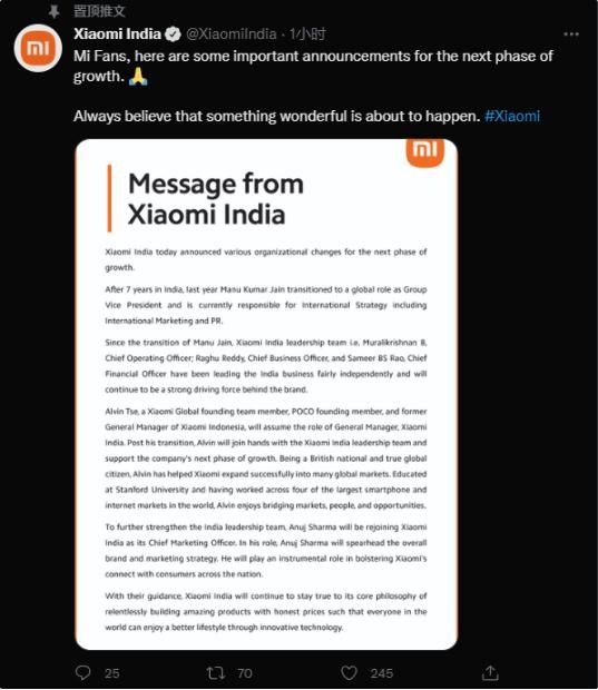 小米今日發(fā)布了一份公告,宣布印度公司將進(jìn)行布組織調(diào)整,這也是小米關(guān)于下一階段增長(zhǎng)的重要調(diào)整。小米還強(qiáng)調(diào):永遠(yuǎn)相信美好的事情即將發(fā)生。