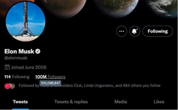 特斯拉首席執(zhí)行官埃隆·馬斯克(Elon Musk)的推特粉絲正式突破 1 億大關(guān),成為該平臺(tái)上第六個(gè)粉絲數(shù)量達(dá)到九位數(shù)的大V。