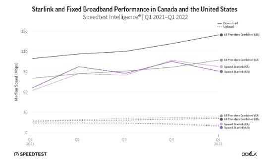 今日,網(wǎng)絡(luò)測(cè)試機(jī)構(gòu) Ookla 發(fā)布了一篇關(guān)于星鏈的報(bào)告,該報(bào)告稱,星鏈的下載速度中位值在加拿大從去年一季度的 61.84 Mbps 提高到了 97.40 Mbps(今年一季度),一年增加了近 58%,在美國(guó)從去年一季度的 65.72 Mbps 提高到 90.55 Mbps(今年一季度),一年增加了近 38%。