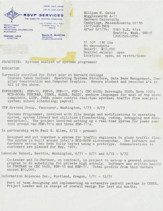 蓋茨的簡歷似乎是用打字機打出來的,這在 1974 年非常正常,當(dāng)時蓋茨和其他人正在幫助推廣個人電腦的使用。