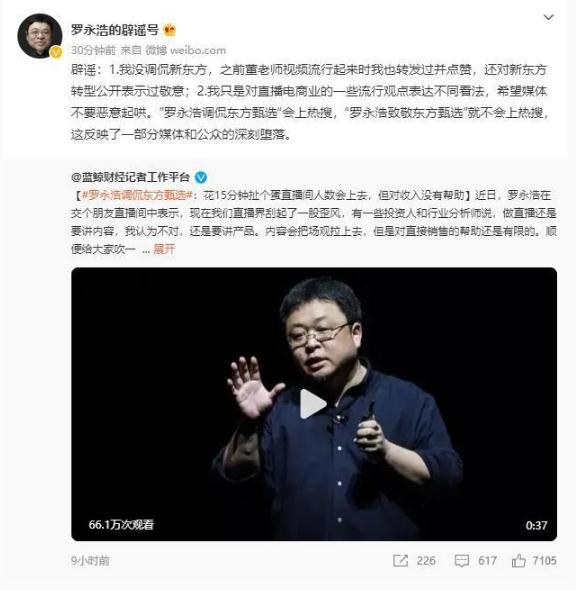 #羅永浩調(diào)侃東方甄選#上熱搜,對此@羅永浩的辟謠號發(fā)文否認(rèn)調(diào)侃新東方。羅永浩在文中表示,“1.我沒調(diào)侃新東方,之前董老師視頻流行起來時(shí)我也轉(zhuǎn)發(fā)過并點(diǎn)贊,還對新東方轉(zhuǎn)型公開表示過敬意;2.我只是對直播電商業(yè)的一些流行觀點(diǎn)表達(dá)不同看法,希望媒體不要惡意起哄。”羅永浩調(diào)侃東方甄選“會上熱搜,“羅永浩致敬東方甄選”就不會上熱搜,這反映了一部分媒體和公眾的深刻墮落。”