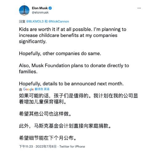 “如果可能的話,孩子是值得的。我計(jì)劃大幅提高公司的托兒福利。希望其他公司也能這樣做。此外,馬斯克基金會(huì)計(jì)劃直接向家庭捐款。希望下個(gè)月能公布細(xì)節(jié)。”馬斯克回復(fù)稱。