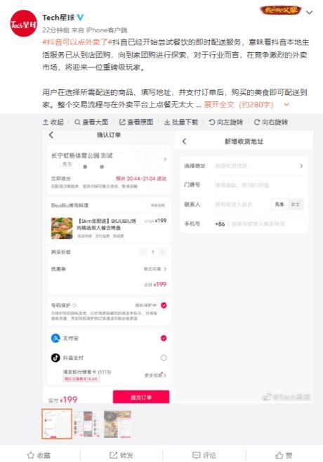 抖音已嘗試推出餐飲即時(shí)配送服務(wù) 目前這一功能叫做“團(tuán)購(gòu)配送” 10:18:41
