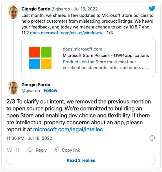 在原本的生效日期(7 月 16 日)后兩天,Giorgio Sardo 在推特上再次出面表示,已經(jīng)對應(yīng)用商店政策做了優(yōu)化,即刪除了第 10.8.7 節(jié)中提到的開放源代碼定價條款,同時,為了強(qiáng)調(diào)微軟的實(shí)際意圖,在第 11.2 節(jié)中添加了指向微軟在線侵權(quán)報告表的鏈接。“我們致力于建立一個開放的商店,讓開發(fā)者有足夠的選擇和靈活性。微軟商店里有很多很棒的免費(fèi)和付費(fèi) OSS 應(yīng)用,我們期待并歡迎更多項目加入。”