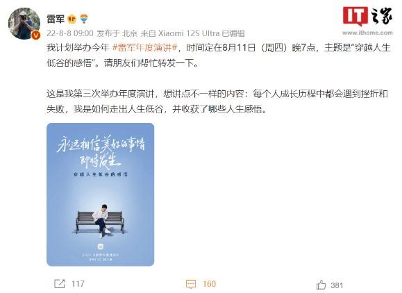 小米創(chuàng)辦人、董事長(zhǎng)兼 CEO 雷軍通過社交媒體表示,計(jì)劃舉辦今年雷軍年度演講,時(shí)間定在 8 月 11 日(周四)晚 7 點(diǎn),主題是“穿越人生低谷的感悟”。雷軍表示,這是他第三次舉辦年度演講,想講點(diǎn)不一樣的內(nèi)容,“每個(gè)人成長(zhǎng)歷程中都會(huì)遇到挫折和失敗,我是如何走出人生低谷,并收獲了哪些人生感悟。”