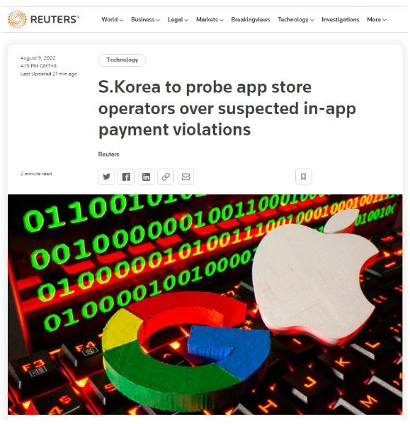 據(jù)路透社報道,韓國電信監(jiān)管機(jī)構(gòu)周二表示,計劃對蘋果公司、谷歌和 One Store 等應(yīng)用商店運(yùn)營商發(fā)起調(diào)查,因?yàn)樗鼈兩嫦舆`反應(yīng)用內(nèi)支付法。