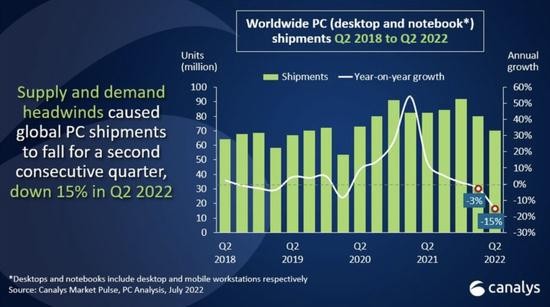 到了第二季度,同比下滑的步伐依然沒能止住,1940 萬臺(tái)的總出貨量,雖然環(huán)比增長了 13%,但對比去年同期還是下降了3%。而從全球市場來看,分析機(jī)構(gòu) Canalys 給出的評價(jià)是——“遭到重大破壞”,總出貨量驟降 15%,這是 2020 年一季度以來的最低水平。