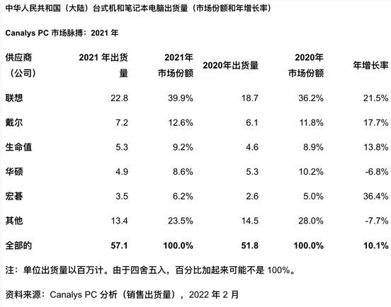 2021 年各品牌在中國市場 PC 產(chǎn)品出貨量 圖源:Canalys