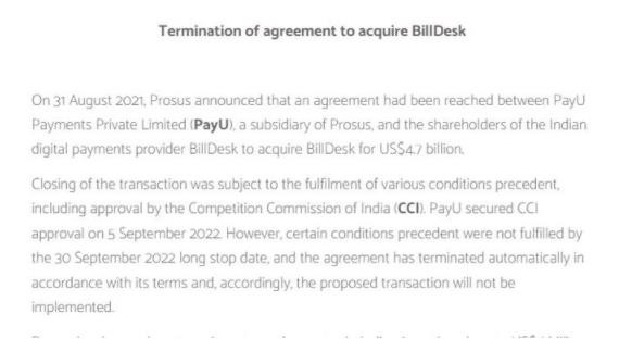 目前還不清楚 Prosus 和 BillDesk 是否已就終止費(fèi)達(dá)成協(xié)議。