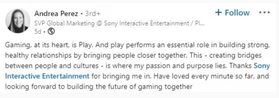 2022 年 9 月,前耐克全球副總裁兼喬丹女子部總經(jīng)理安德烈-佩雷斯成為索尼互動(dòng)娛樂(lè)(SIE)/PlayStation 的全球營(yíng)銷高級(jí)副總裁。這一消息被多家媒體以及 SVP 的領(lǐng)英爆出,佩雷斯就她在耐克的工作和她在 SIE 的新角色進(jìn)行了分享。