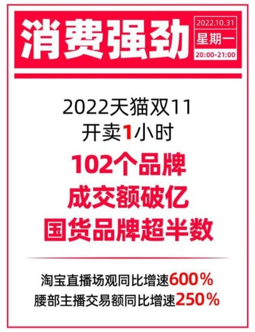 天貓雙 11 第一波售賣正式開啟。銷售 1 小時,102 個品牌成交額過億元。