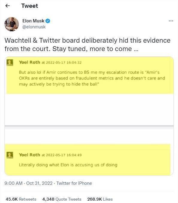 馬斯克在推特上稱,“Wachtell 律師事務(wù)所和推特董事會故意向法院隱瞞了這一證據(jù)。”馬斯克似乎還威脅要采取進(jìn)一步的法律行動,他寫道:“請繼續(xù)關(guān)注,還會有更多信息……”