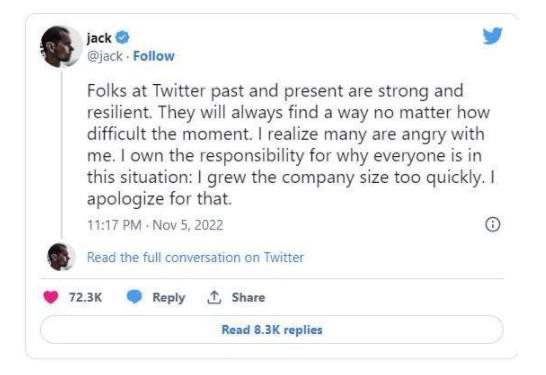 多西在推文中寫道:“推特過去和現(xiàn)在的員工都很堅(jiān)強(qiáng)。不管遇到多么困難的情況,他們總會(huì)找到辦法解決。我知道,很多人都對(duì)我感到不滿,我應(yīng)該對(duì)他們?nèi)缃竦奶幘池?fù)有責(zé)任,畢竟是我讓公司擴(kuò)張得太快了。我對(duì)此深表歉意。”