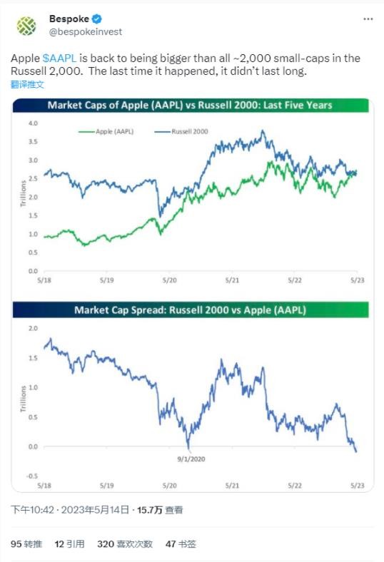 根據(jù)彭博社報(bào)道,蘋(píng)果公司的市值已超過(guò)羅素 2000 指數(shù)(Russell 2000)總和兩周時(shí)間,這是有記錄以來(lái)最長(zhǎng)的一次。