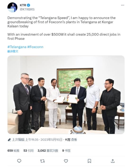蘋果供應商富士康在在印度南部 Telangana 邦的第一家工廠今日破土動工。該邦的 IT 部長周一透露,富士康將在該地投資 5 億美元(IT之家備注:當前約 34.8 億元人民幣),將直接創(chuàng)造 25,000 個工作崗位。