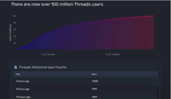 北京時(shí)間周一午后 15 點(diǎn)左右,據(jù)數(shù)據(jù)追蹤網(wǎng)站 Quiver Quantitative 披露,Threads 的登錄用戶數(shù)已經(jīng)突破 1 億人。此時(shí)距這款軟件 7 月 5 日在美洲地區(qū)首發(fā)上線連 5 天整都沒(méi)到。