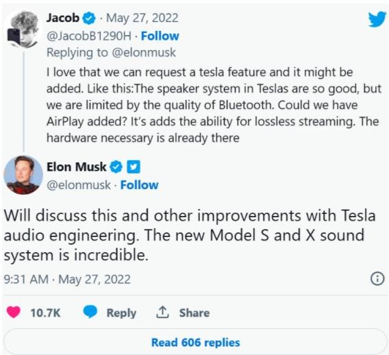 馬斯克在一年以前曾在推特上表示,特斯拉汽車未來將考慮增加蘋果隔空播放(AirPlay)支持,以提升 iPhone 無線播放音樂時(shí)的音頻質(zhì)量,馬斯克當(dāng)下兌現(xiàn)了他此前的承諾,特斯拉汽車有望在近期獲得 AirPlay 功能。