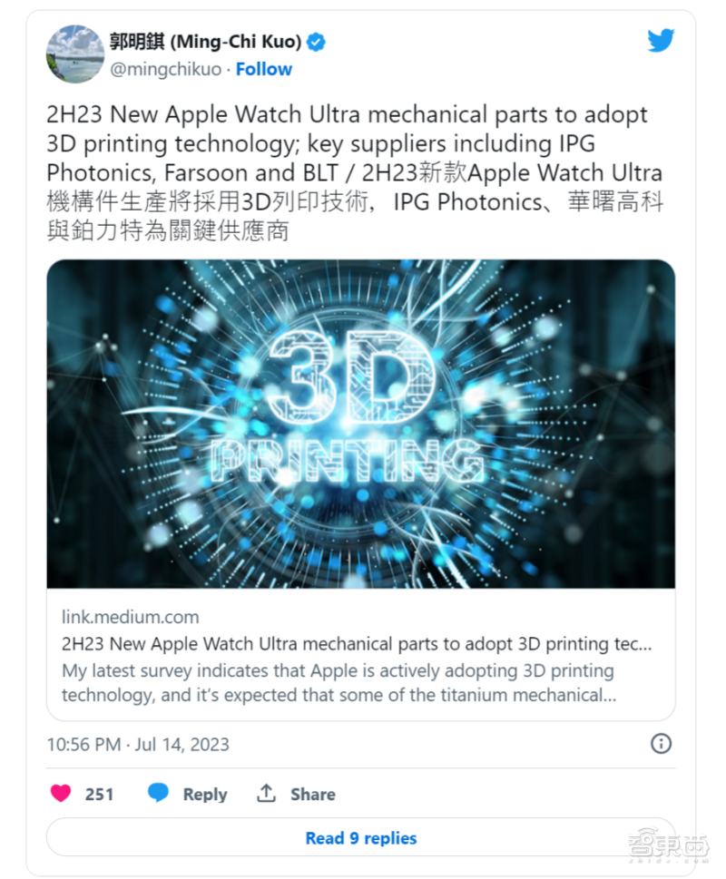 當(dāng)然,沒(méi)有一家廠商采用新技術(shù)是為了增加成本。根據(jù)郭明祺爆料,他認(rèn)為 3D 打印技術(shù)會(huì)降低蘋(píng)果 Apple Watch Ultra 鈦合金零部件的生產(chǎn)成本,同時(shí)對(duì)于蘋(píng)果達(dá)成一些綠色環(huán)保方面的目標(biāo)會(huì)更加有利。