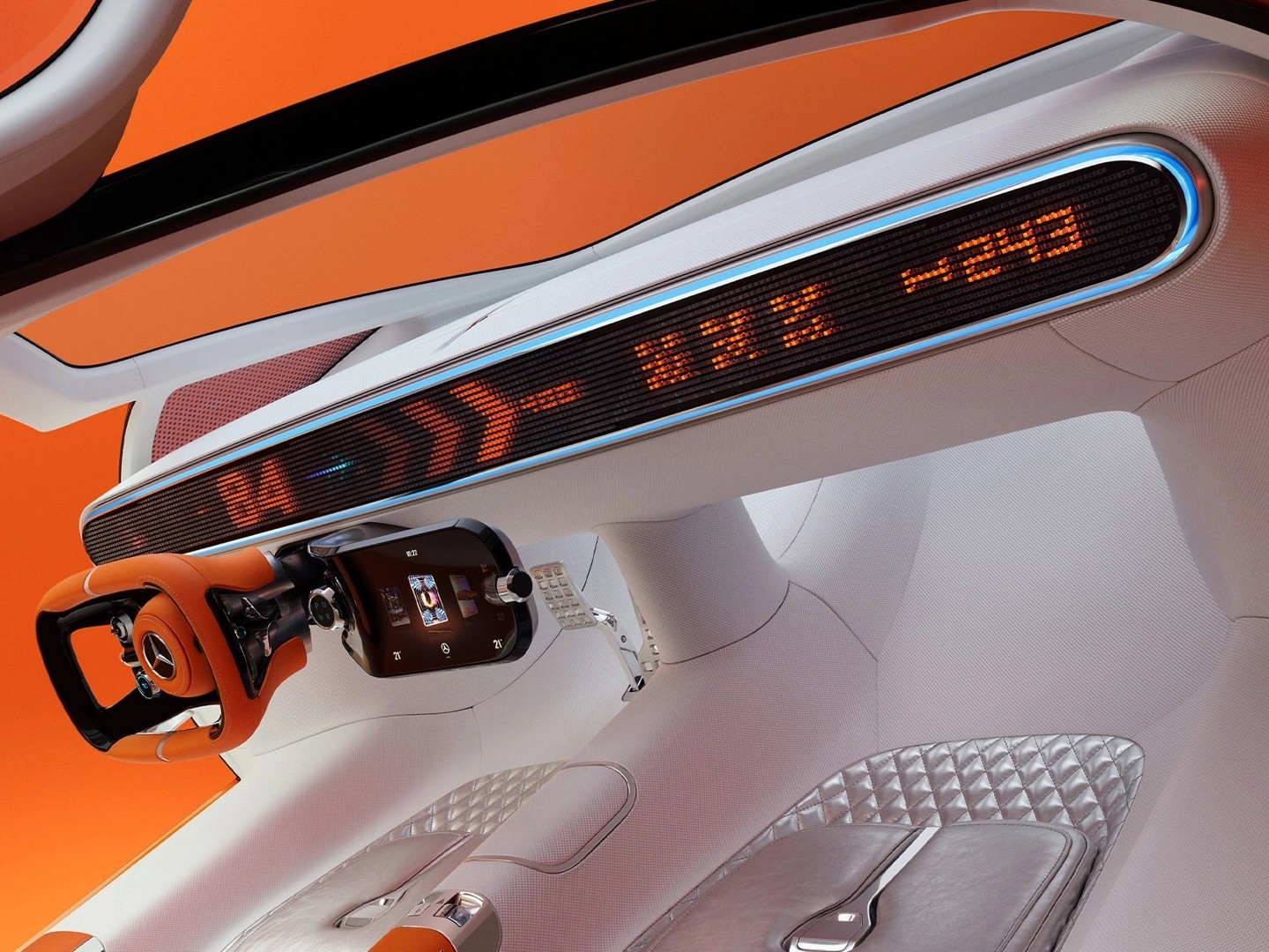 其配備有一條細(xì)長(zhǎng)的像素風(fēng)車機(jī)屏幕,用以顯示車輛時(shí)速等核心信息,奔馳官方將這種設(shè)計(jì)稱之為“復(fù)古未來(lái)主義的 8-bit 像素風(fēng)格”,奔馳還與 Magic Leap 進(jìn)行合作,佩戴 Magic Leap 2 AR 眼鏡,還會(huì)在車內(nèi)實(shí)時(shí)顯示 AR 地圖、可交互按鈕、虛擬儀表盤等內(nèi)容。