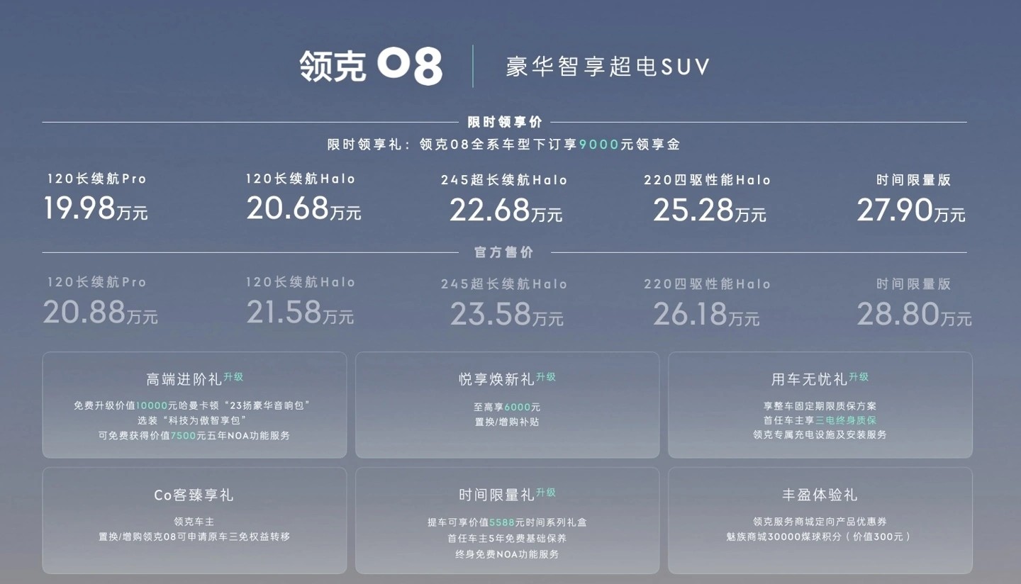 領(lǐng)克旗下定位為“豪華智享超電 SUV ”的全新車(chē)型 —— 領(lǐng)克 08,在時(shí)隔將近半年的預(yù)熱之后,已于今晚正式上市。新車(chē)推出 5 款不同配置,售價(jià)區(qū)間為 20.88 萬(wàn)元-28.80 萬(wàn)元。此外,領(lǐng)克汽車(chē)還推出全系車(chē)型下訂享 9000 元的“限時(shí)領(lǐng)享禮”,相當(dāng)于該車(chē)起售價(jià)為 19.98 萬(wàn)元。附不同車(chē)型價(jià)格如下: