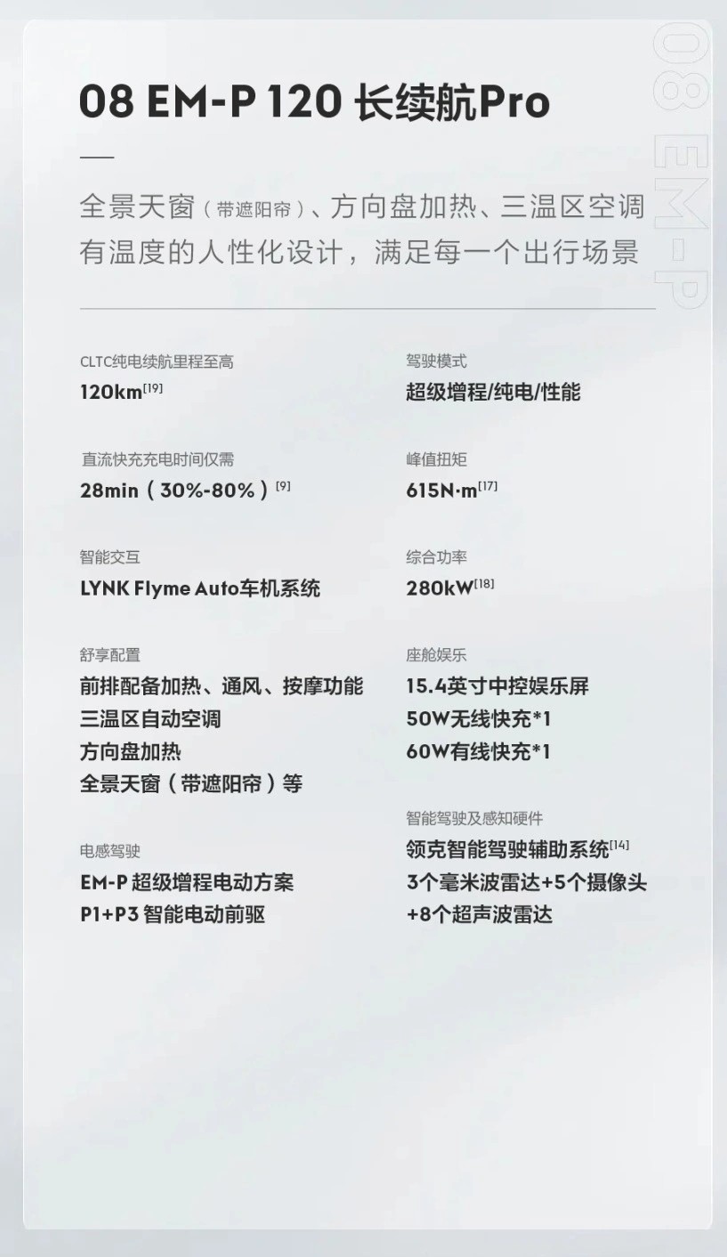 三電機(jī)四驅(qū)版的領(lǐng)克 08 采用 1.5T 電混發(fā)動(dòng)機(jī)和三電機(jī)(P1+P3+P4)布局,綜合功率 436kW,最高扭矩可達(dá) 905N?m,官方宣稱(chēng)百公里加速時(shí)間為 4.6 秒。
