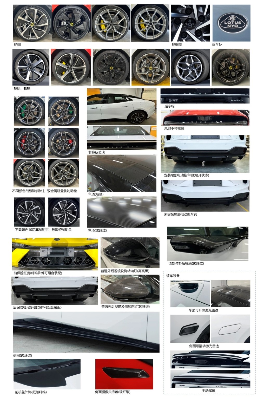 申報圖片顯示,路特斯 Emeya 純電超跑提供黑白兩種配色,車頂、流媒體外后視鏡、側(cè)圍、前機蓋外飾板、前后保險杠等均提供碳纖維套件。此外,該車車頂配備可升降激光雷達(dá),側(cè)面配備可翻轉(zhuǎn)激光雷達(dá),車尾配備主動尾翼。