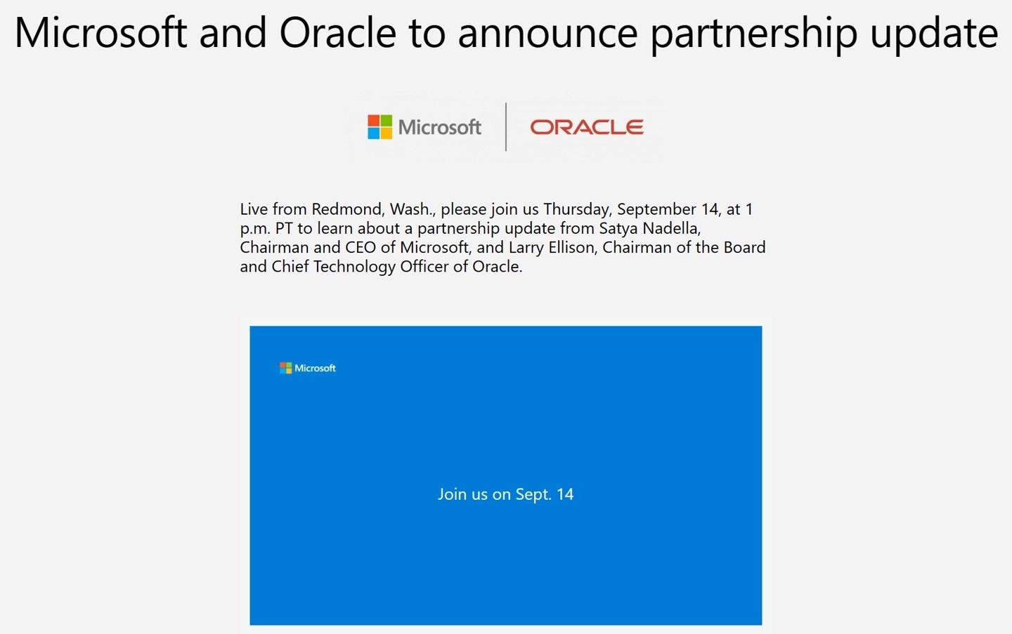 微軟官網(wǎng)日前上線了一則媒體公告,微軟和甲骨文(Oracle)將于當(dāng)?shù)貢r(shí)間 9 月 14 日星期四下午 1 點(diǎn)(注:北京時(shí)間 9 月 15 日凌晨 5 點(diǎn))發(fā)布最新的合作消息。