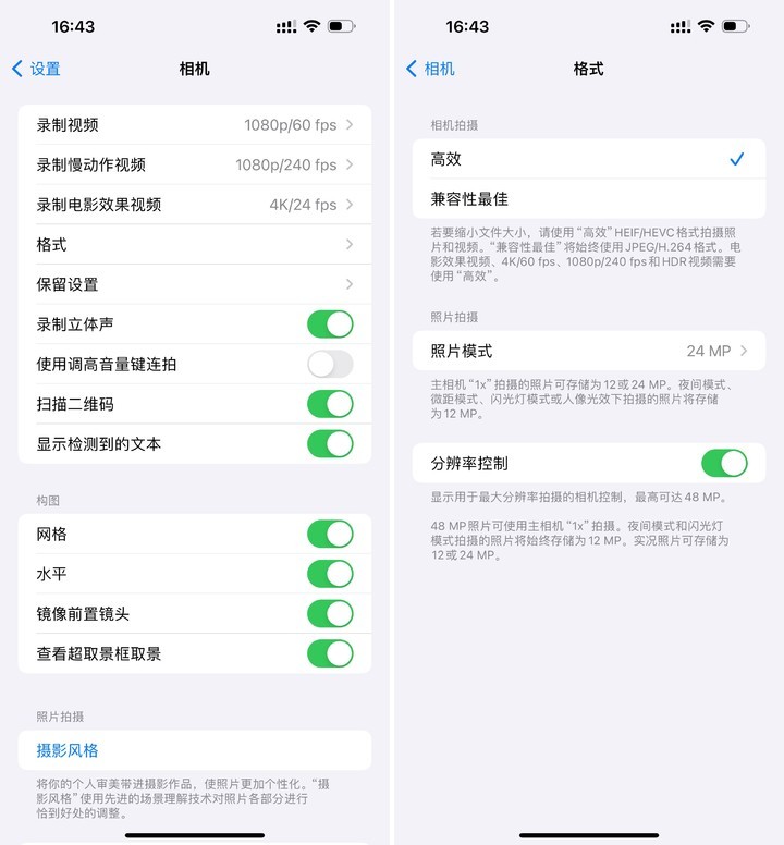 iPhone 默認(rèn)隱藏了這個(gè)選項(xiàng),需要在「設(shè)置-相機(jī)-格式-分辨率控制」中手動(dòng)開(kāi)啟,之后在取景上方畫(huà)面中點(diǎn)擊 HEIF MAX 選項(xiàng)即可開(kāi)啟 4800 萬(wàn)像素的最大分辨率,成像解析力提升非常明顯,很適合風(fēng)光攝影。