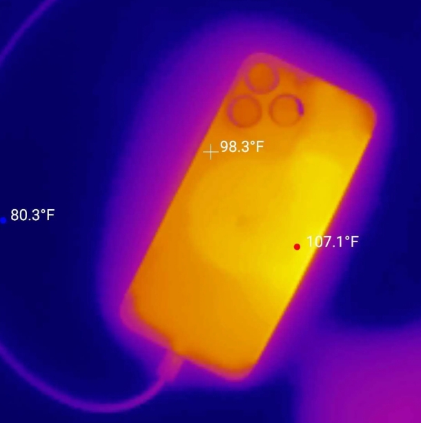 在升級(jí) iOS 17.0.3 系統(tǒng)之前,iPhone 15 Pro 和 iPhone 15 Pro Max 在充電狀態(tài)下最高溫度為 107.1 華氏(41.7 攝氏度),而且經(jīng)常會(huì)超過 100 華氏。