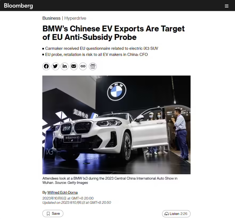 歐盟上月宣布對中國電動汽車展開反補貼調(diào)查,相關消息“一石激起千層浪”,引發(fā)各界人士極大的爭議。彭博社在當?shù)貢r間周五的報道中聲稱,寶馬公司收到了歐盟關于其純電車型 iX3 的“信息請求”,這將是歐盟調(diào)查中國電動汽車制造商補貼的一部分。