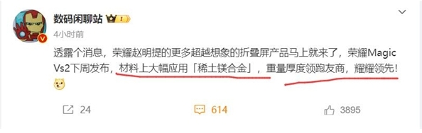 博主數(shù)碼閑聊站透露,榮耀新款折疊屏Magic Vs2即將發(fā)布,這款新品應(yīng)用了稀土鎂合金,重量厚度將會再創(chuàng)新紀(jì)錄,遙遙領(lǐng)先友商。