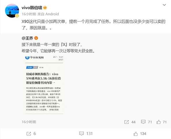 vivo韓伯嘯表示,vivo X90系列這代加了兩次單,但還是提前一個月完成了銷售任務,后面沒有多少貨可以賣了?! ?/p>