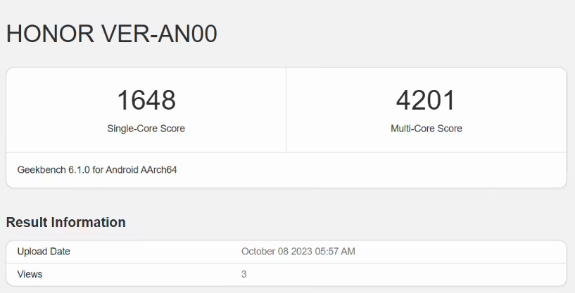 跑分信息顯示,這款新機的單核得分為 1648,多核得分為 4201,搭載安卓 13 系統(tǒng),測試機型為 16GB 內(nèi)存版本。
