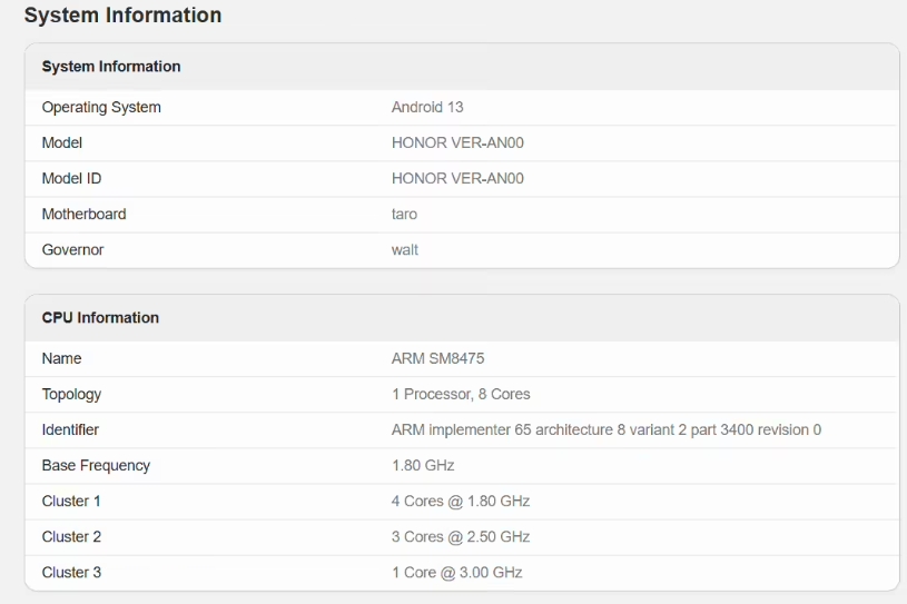 從該網(wǎng)站還可以看到,這款新機搭載驍龍 8 + 處理器降頻版,CPU 由 1 個 3.00 GHz 核心 + 3 個 2.50 GHz 核心 + 4 個 1.80 GHz 核心組成。作為對比,驍龍 8 + 處理器 CPU 由 1 個 3.2GHz 核心 + 3 個 2.75GHz 核心 + 4 個 2.0GHz 核心組成。