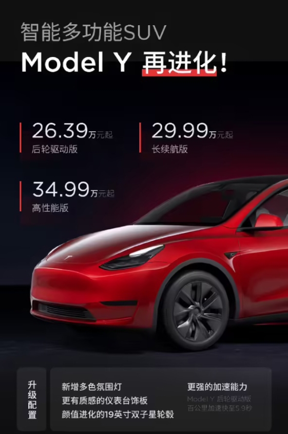 10 月 1 日,特斯拉宣布 Model Y 汽車迎來(lái)升級(jí),新增多色氛圍燈、全新儀表臺(tái)飾板等,百公里加速提升至 5.9 秒,而且依然維持在 26.39 萬(wàn)元。