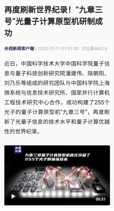 據(jù)央視新聞報道,近日,我國成功構(gòu)建了 255 個光子的量子計算原型機“九章三號”,再度刷新了光量子信息的技術(shù)水平和量子計算優(yōu)越性的世界紀錄。