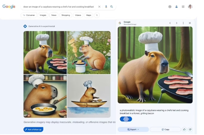 有時(shí)用戶將正在尋找特定的圖像,但無法準(zhǔn)確找到自己想要的圖像。為此,從今天(當(dāng)?shù)貢r(shí)間本周四)開始,谷歌將推出利用人工智能驅(qū)動(dòng)的生成搜索體驗(yàn) (SGE) 創(chuàng)建圖像。例如,用戶想為一位喜歡烹飪且最喜歡的動(dòng)物是水豚的朋友制作一張卡片,可以利用該功能搜索類似“畫一張戴著廚師帽和烹飪?cè)绮偷乃嗟膱D片”,SGE 將在結(jié)果中提供最多四個(gè)生成的圖像。用戶可以根據(jù)搜索結(jié)果進(jìn)一步編輯描述并添加更多細(xì)節(jié),將自己的愿景變?yōu)楝F(xiàn)實(shí)。