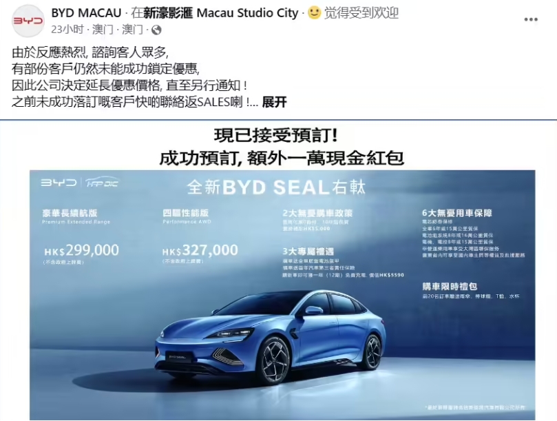 在發(fā)布會現(xiàn)場,比亞迪亞太汽車銷售事業(yè)部總經(jīng)理劉學(xué)亮表示:“進(jìn)入澳門地區(qū)市場以來的十年,比亞迪一直專注于為消費者提供高質(zhì)量、高性能和高安全性的汽車產(chǎn)品與優(yōu)質(zhì)的服務(wù)。2022 年,比亞迪首款面向全球市場的新能源乘用車 BYD ATTO 3(國內(nèi)命名為元 PLUS)在澳門地區(qū)上市。今年 8 月,比亞迪為澳門地區(qū)的消費者帶來了基于海洋美學(xué)設(shè)計的首款車型海豚,讓越來越多的消費者體驗到比亞迪新能源汽車帶來的駕駛樂趣。比亞迪海豹的上市,是比亞迪在澳門地區(qū)市場邁出的重要一步。”
