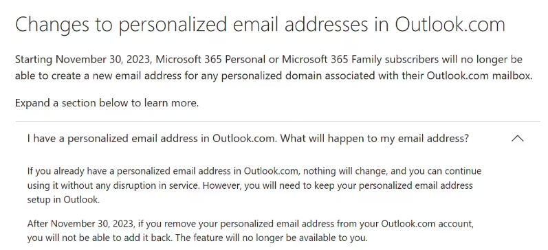 在 11 月 30 日后,現(xiàn)有 Outlook.com 域名的個人郵件還是可以繼續(xù)使用,用戶也可以為 Outlook.com 域名的個人郵件設(shè)立別名(alias),但無法再綁定任何個人域名。